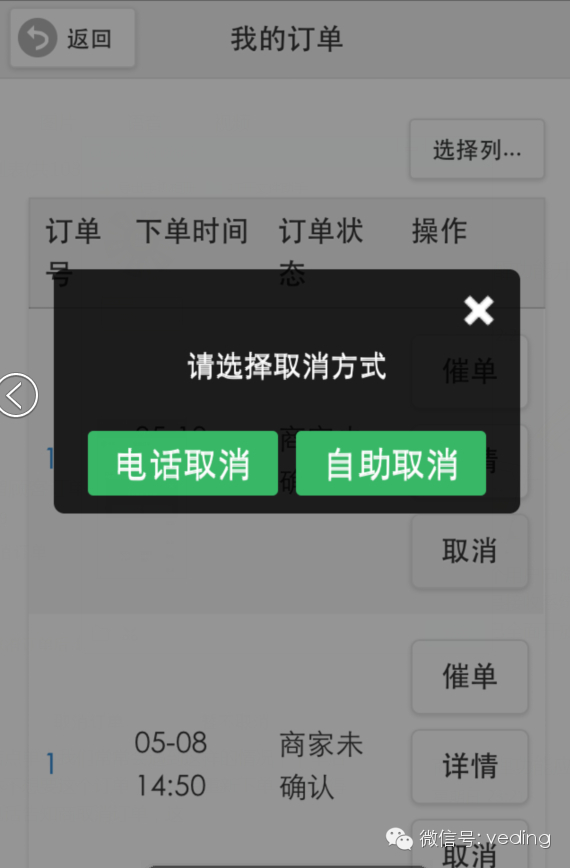 顾客通过微信端个人中心的我的订单“未处理订单”和“已确认订单”进行订单取消操作,点击取消订单会弹出两种取消方式:自助取消和电话取消,也就是说顾客可以通过电话取消,也可以通过自助取消订单。