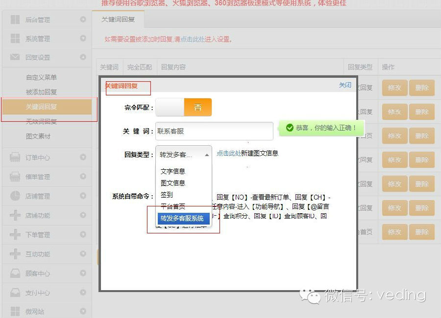 2、然后,登录微订后台,在关键字回复中选择“转发多客服系统”这一功能的关键词。