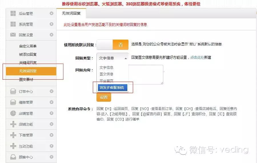 点击回复设置--无效回复,即可看到回复类型中有个“转发多客服系统”,如下图所示: