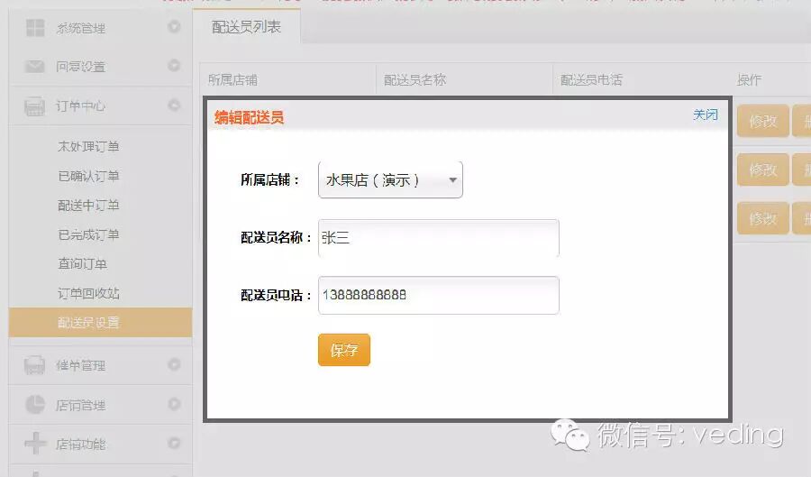除了对商品分类区分店铺,我们对配送员也进行了店铺区分,也就是说商家可以在后台对店铺进行单独的配送员新建,而不是多个店铺共用配送员,也不会显得那么杂乱了,保证了配送的效率。如下图所示: