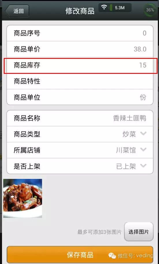 新版本中新增的库存功能可以同步后台的库存,商家可以在客户端进行库存修改,不用登陆电脑系统后台了,手机客户端一键搞定,方便快捷了许多有木有。如下图所示: