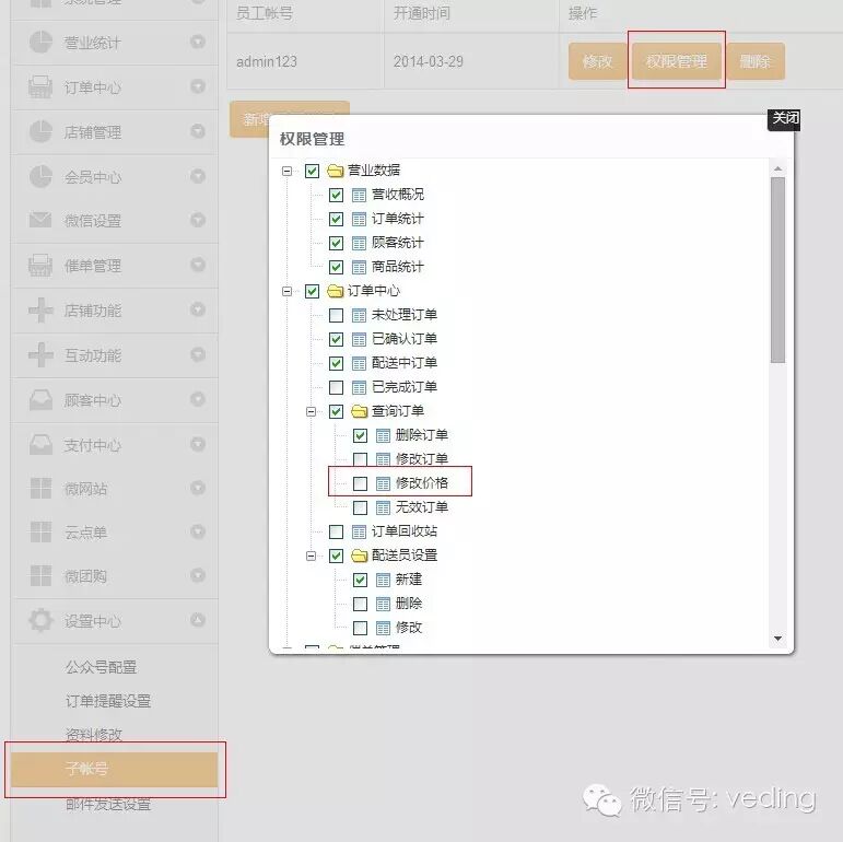 除了总账号可以修改价格之外,子账号也可以有权限修改价格。商家可以给子账户指定相应的权限,如上图所示。