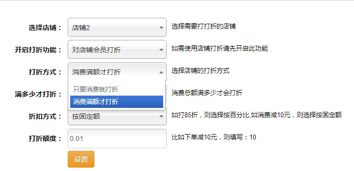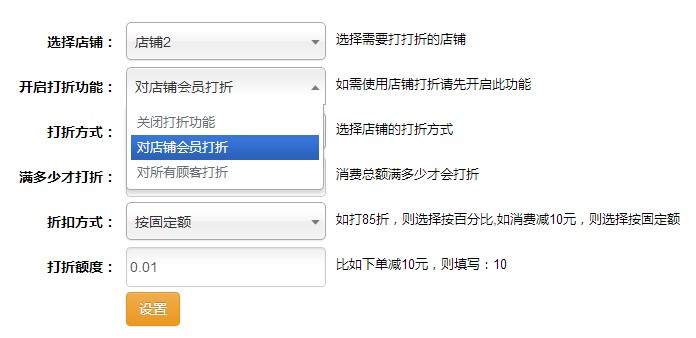 二、选择对应的店铺,可以单独对店铺会员实现打折,也可以对所有顾客进行打折
