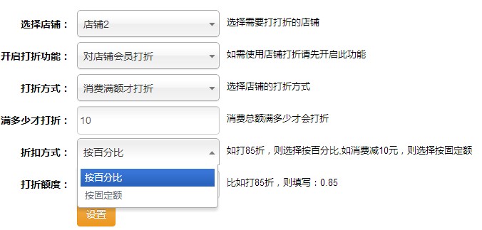 四、对的没错,您没有看错,我们还可以设置打折的方式,有两种人性化的打折方式:按百分比打折,按固定额度打折。比如你要打88折,则可选择按百分比打折,然后输入0.88。如果你想满100元送5元,你可以选择按固定额打折: