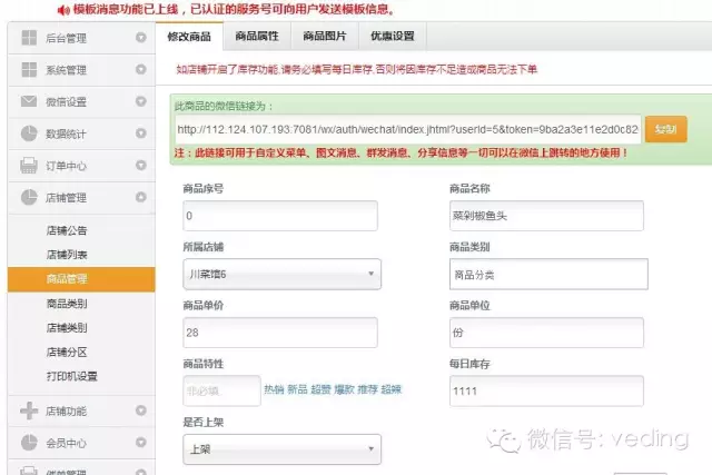 商家通过微订的后台,店铺管理,商品管理,修改某个商品基本信息获取独立链接。如下图所示: