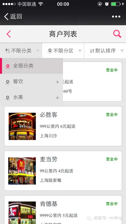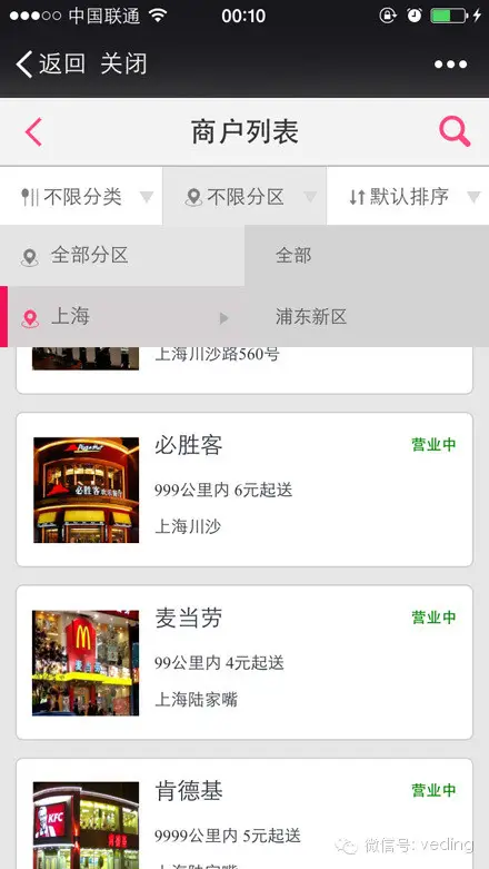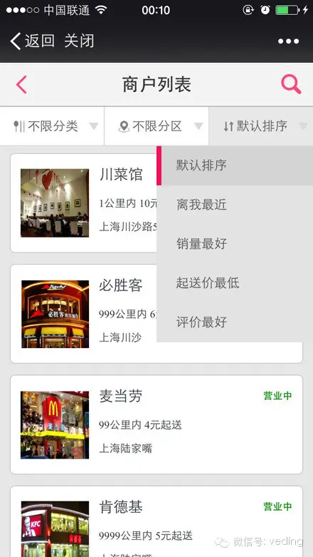 除了支撑店铺分类筛选,还支持店铺分区筛选以及销量、评价、起送价排序筛选,让用户准确的找到自己想要的店铺,不在繁琐的通过下拉找寻了,一步筛选搞定!