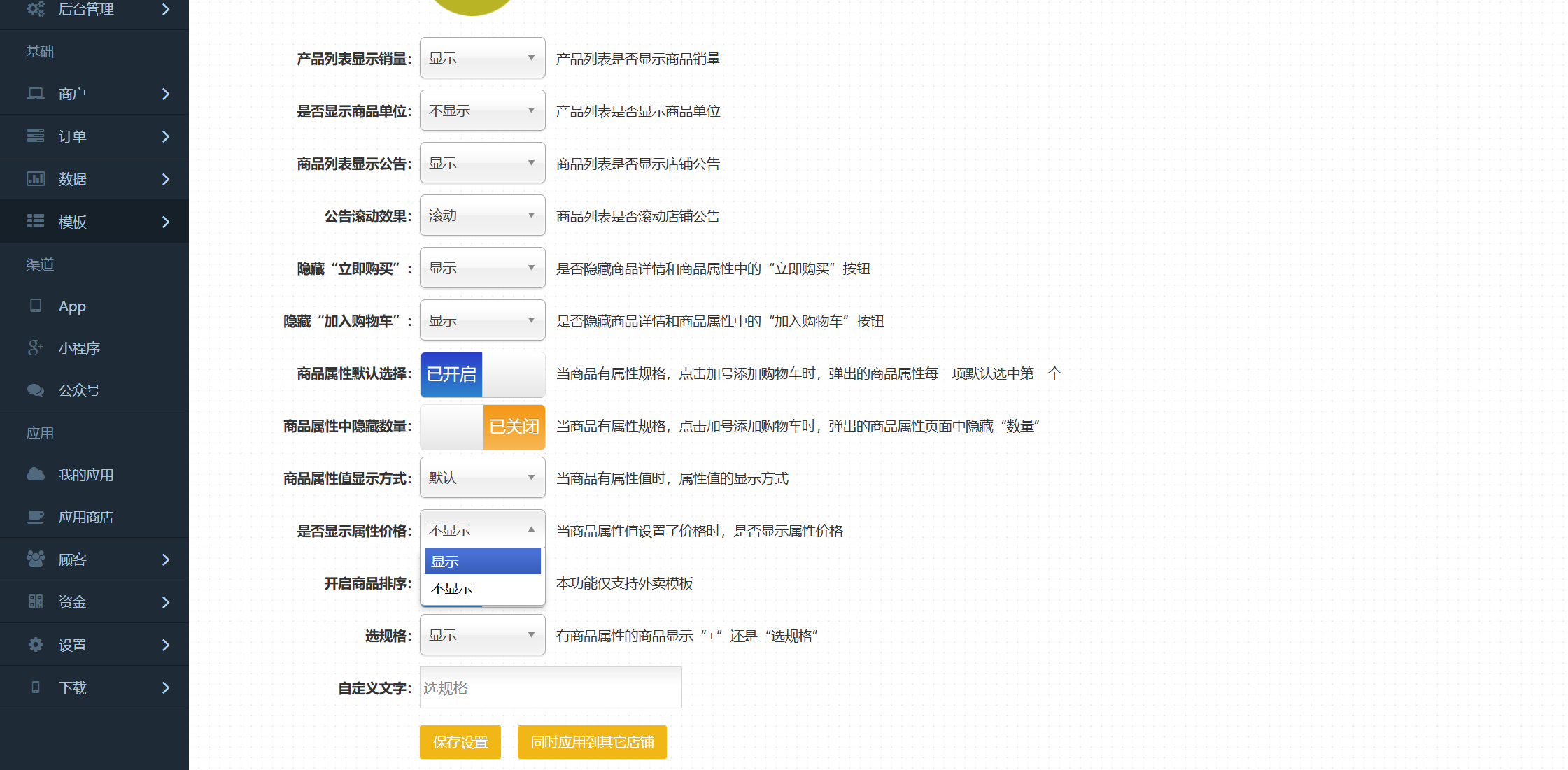六、商品属性价格显示功能升级,当属性有加2元加3元这种加价时,可以自定义关闭和开启显示加价的价格