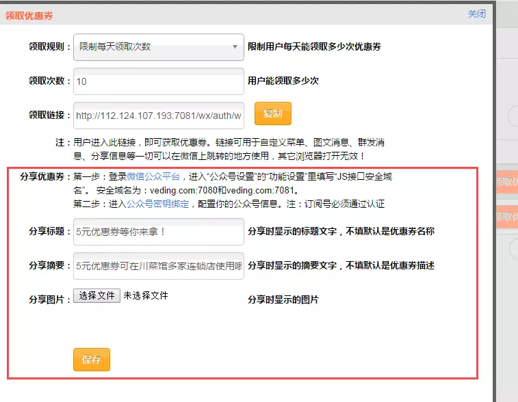首先,商家需要在微订后台进行简单的设置,在店铺功能——优惠券设置——领取优惠券。如下图所示: