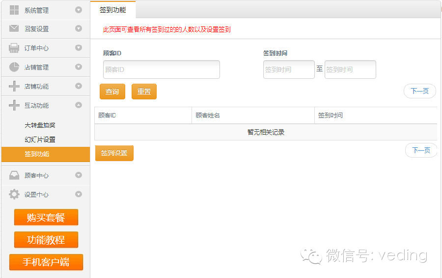 首先,商家登录微订后台,切换至互动功能--》签到功能: