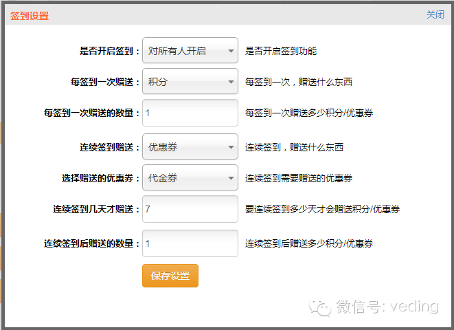 一、是否开启签到:此项设置签到功能的开启状态,可选:关闭,对会员开放,会所有人开放。