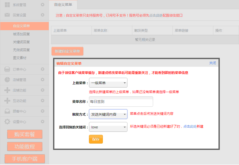 点击新建自定义菜单,即弹出新建的界面,依次选择上级菜单,输入菜单名称,如:签到。然后触发方式选择:发送关键词内容,最后选择签到的这个关键词就可以,如:刚刚我们新建的“love”关键词就是签到功能的。
