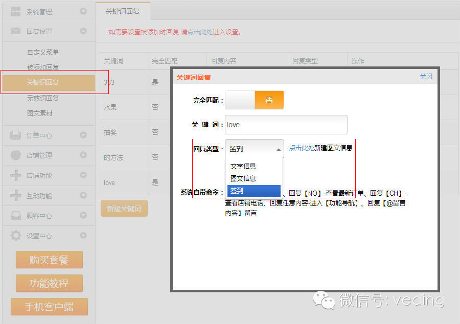新建一个签到的关键词,比如:我们设置的是回复“love”,即可签到。就是说,您的顾客只需要向你的公众号发送“love”字样,即可完成签到,够清晰明了了吧。