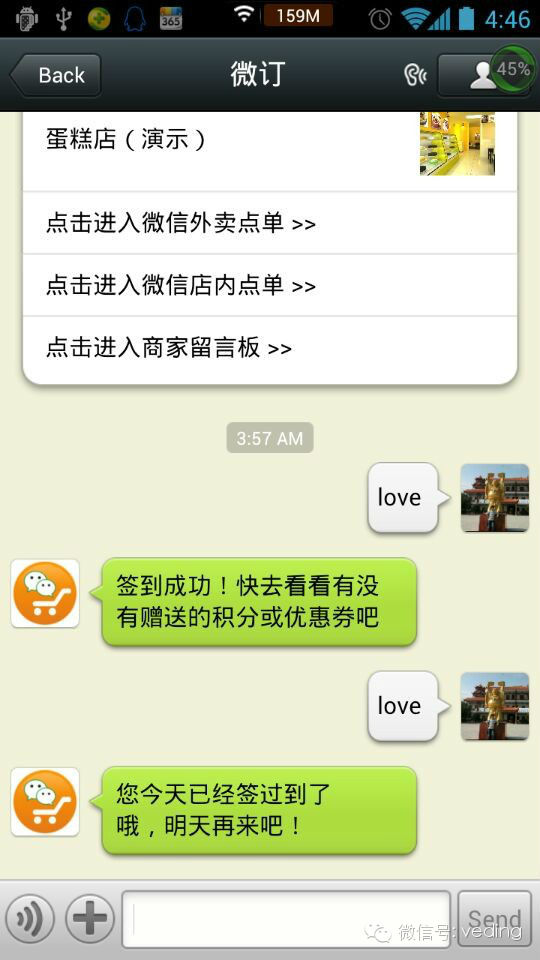 这样,顾客点击您的自定义菜单即可完成签到了,真是方便快捷。如图即是微信上签到的功能: