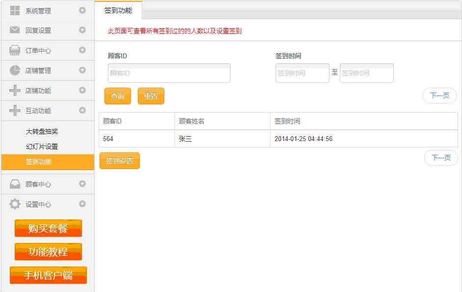 这即是青春版的个人中心签到功能,其它版本使用都是一样,这里就不另做演示了。然后商家登录系统后台,即可以看到顾客签到的列表了: