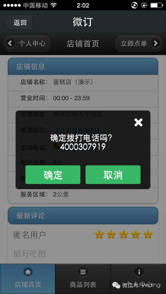 微信店铺首页支持直拨电话功能,用户在微信上不仅能够快速下单,而且还可以快速直拨商家的电话了,再也不用输入长长的电话号码了,一键点击拨打,即可快速准确的与商家进行交流,让微信点单更加方便、快捷,与此同时也大大减少了用户的无效订单的产生。