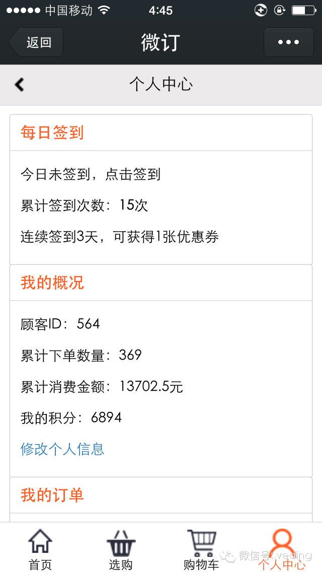 四、最后即是个人中心,全能的“顾客阵营”,快速了解自己的相关信息,签到、积分、会员、优惠券应有尽有: