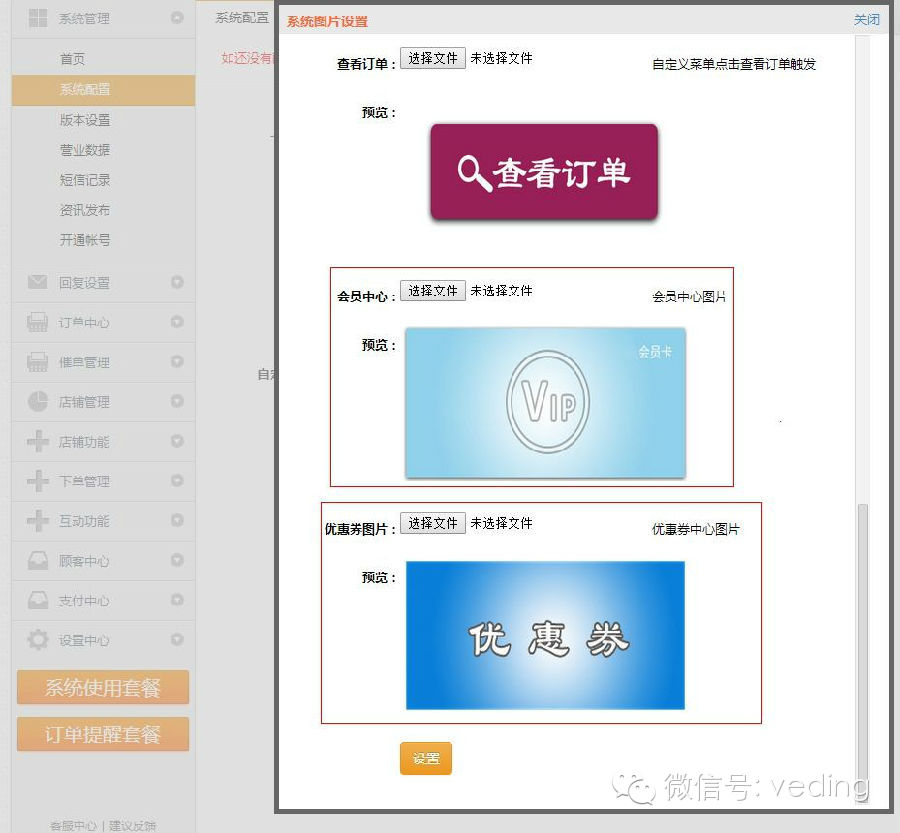 会员卡图片和优惠券图片可用自定义啦,制作属于自己的会员卡和优惠券,不局限于系统提供的图片了,商家们你还在等什么,开始制作属于自己的卡哇伊图片把,把系统图片狠狠的甩在脑后打造强大的营销利器吧。 具体在哪里可以设置呢?在系统后台,系统管理模块,系统配置功能,自定义系统图片中可以修改会员卡图片和优惠券图片了。 下一条:确认订单支持短信通知用户 免责声明:部分文章信息来源于网络以及网友投稿,本网站只负责对文章进行整理、排版、编辑,是出于传递更多信息之目的,并不意味着赞同其观点或证实其内容的真实性,如本站文章和转稿涉及版权等问题,请作者及时联系本站,我们会尽快处理。 责任申明:官方所有内容、图片如未经过授权,禁止任何形式的采集、镜像,否则后果自负! 标题:自定义会员卡图片,优惠券图片 地址:https://www.veding.com/static/v2/notice/111.html 相关资讯