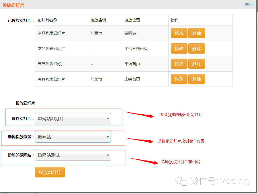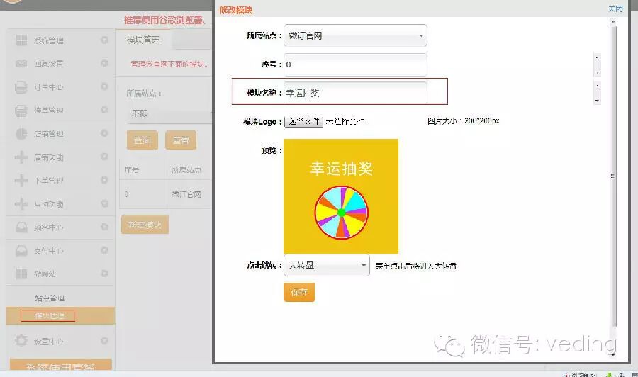 是不是有点小激动呢?赶紧的去搭建自己的微网站,登陆微订系统后台就可以完成,还是跟随微订哥学习一下吧。 一、如何来新建一个微网站呢? 1、首先我们要新建一个站点,在微订系统后台,“微网站”功能模块新建站点,填写站点名称,选择站点模块(目前只有默认,后续会开发多样式),上传站点logo,如图所示: 上面就简单的搭建了一个站点,光搭建站点是还没完工的哦,还需要对站点内部(微网站首页)进行设置,微网站首页是由头部幻灯片和网站模块组成,那么我们先来看看网站幻灯片如何设置。 (1)在“互动功能”中幻灯片设置新建一个幻灯片,如图所示: (2)将新建好的幻灯片投放到微网站中,如图所示: 2、接下来是新建微网站下面部分,即网站模块了,微网站下面的六个小模块都可以自定义图片和名称,还可以控制点击模块跳转到具体位置,举例,新建一个“幸运抽奖”的模块,如下图所示: