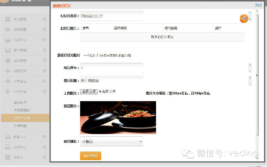 3、除了上面的回复设置可以进入微网站,还可以通过幻灯片图片跳转到微网站,在“互动功能”中“幻灯片设置”新建幻灯片的时候选择图片触发为“链接微网站”,这样你投放的幻灯片就可以跳转到微网站了,如图所示: