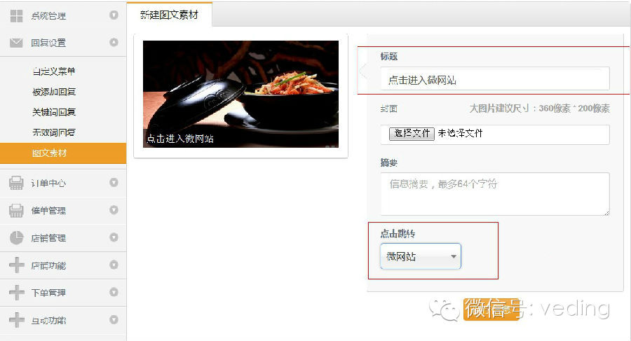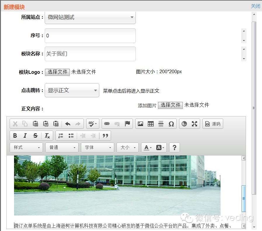 上面是可以新建跳转的模块,那么如何来新建不能跳转的模块,像图文信息那样的模块呢?我们就拿“关于我们”这个模块来举例,首先我们分析得知“关于我们”就是由图片和文字组成,那么我们在新建这个模块的时候就选择正文,在正文编辑器里面进行编辑,如图所示: 那么如何搭建微社区模块呢,其实很简单 原理和上面的一样,只需在新建模块选择点击跳转到“自定义链接”,将微社区的自定义链接输入保存即可! 二、新建好了微网站那么在哪里可以进入呢? 1、我们可以在“回复设置”里面进行设置,如果你的“服务号”那么你可以在“自定义菜单”选择“触发方式”为“发送微网站链接,用户可以通过点击自定义菜单得到一个进入微网站的图文信息,点击图文就可以进入微网站,如图所示: 2、不是服务号没关系,订阅号也可以用微网站,只需要在回复设置里面进行设置,如果你想要用户一关注就看到微网站信息图文,那么你可以新建一个图文素材,选择点击跳转类型为“微网站”,然后你可以在被添加回复,关键词回复,无效回复里面调用这个图文信息,用户通过回复的信息就可以获取到进入微网站的入口,如图所示: