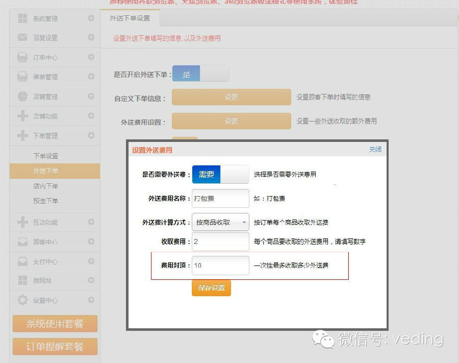 1、先来看看“外送费封顶设置”是如何设置运用的。 此功能商家可以在系统后台,在下单管理中的“外送下单”进行“外送费设置”,操作如下图: 设置封顶费,一次性最多收取多少外送费。