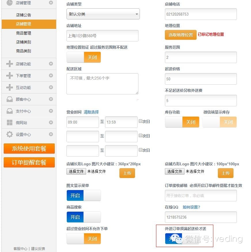 2、商家自定义“外送需满起送价才送”,这一功能听起来瞬间让自己智商捉急,如果开启了“外送需满起送价才送”这一选项,则用户下单不足起送价将无法提交订单,如果不开启,则按照不足起送价另外收费来算,顿时,小编不明觉厉,具体设置,商家可以在店铺管理里面的“店铺管理”编辑店铺里面设置此功能,如下图设置: