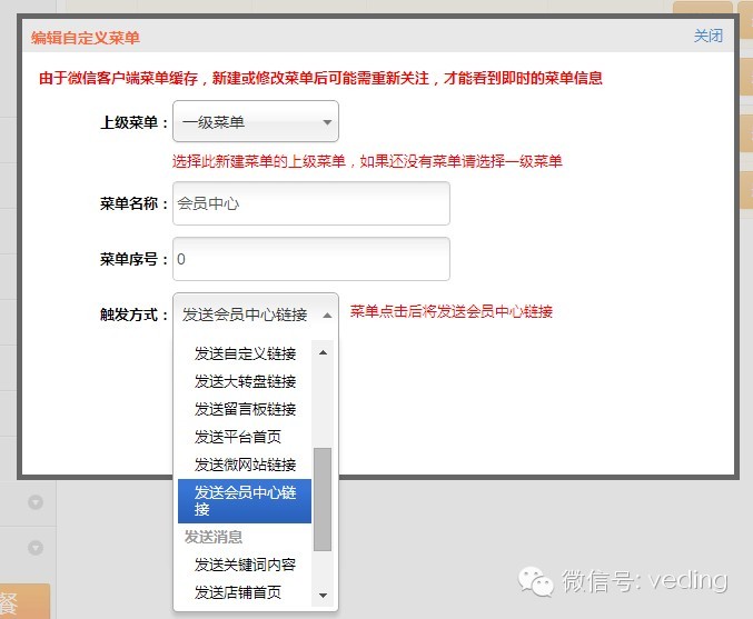 3、会员中心独立设置,可以通过自定义菜单跳转进入,也可以在图文素材中跳转进入,无需进入个人中心了。 自定义菜单可以选择进入“会员中心”。