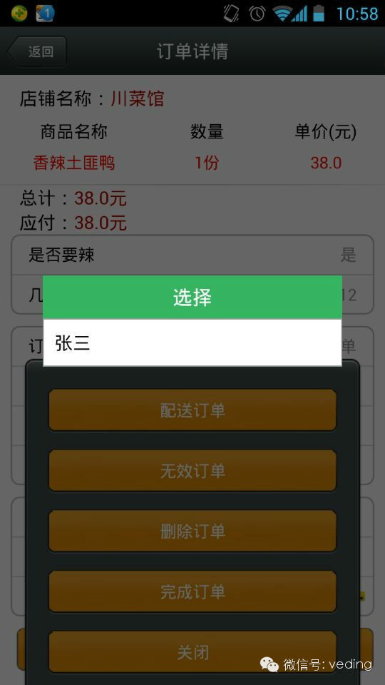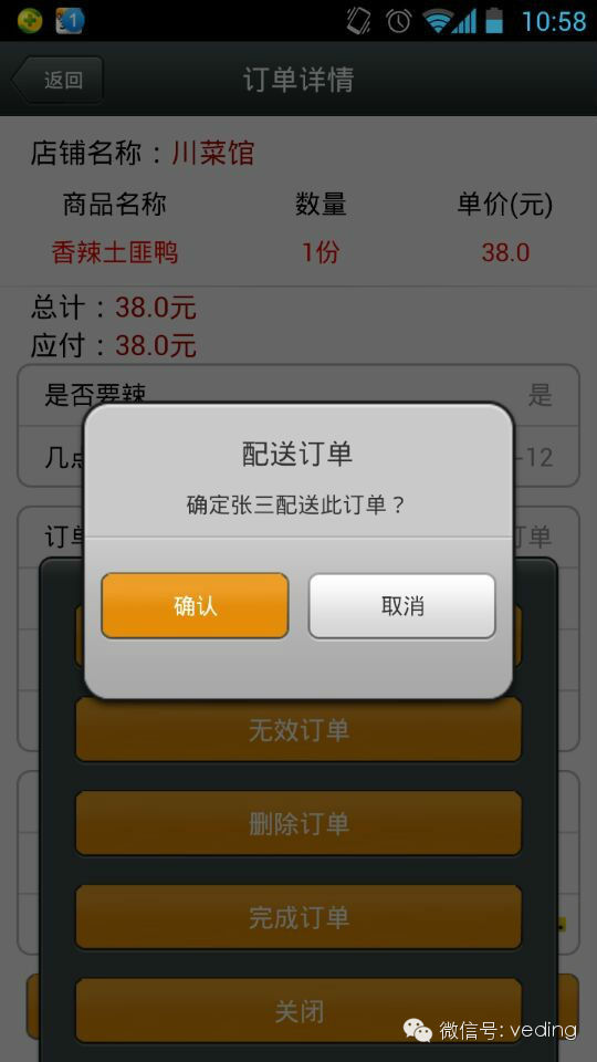 一、新增“新增配送员”功能,减轻了商家的配送负担,再也无需登录微订系统后台选择配送员了,只需轻轻点击客户端配送按钮,就能无缝完成订单配送,方便快捷,实用性极强!操作如图所示: 在“已确认”的订单中选择“处理订单”,然后会弹出一个窗口,选择配送订单即可,随后会选择配送员,如下图所示: