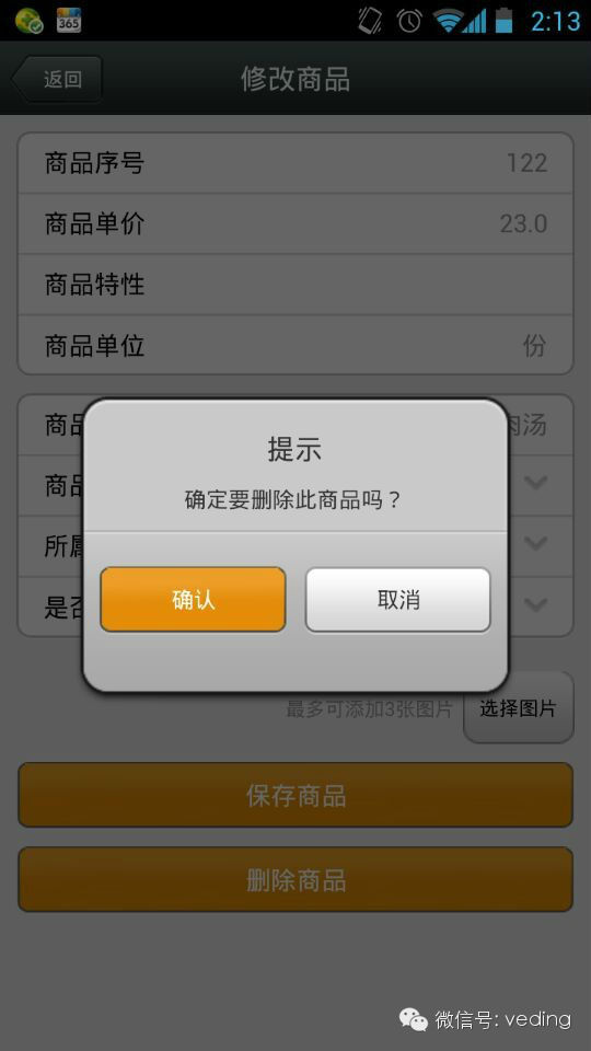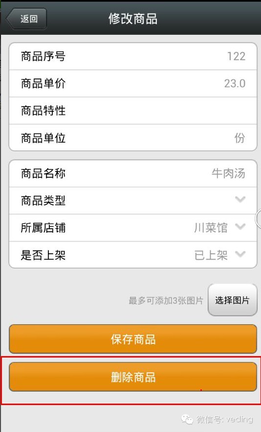 商品上传图片可以通过手机拍照或者从图库中选择了,随手拍就可以完成商品的效果图了。 三、有新增商品功能,必然就有删除商品功能,我们的程序猿们不会犯那么低级的错误,删除商品功能也推出了,用户只需点击商品,在最下面会出现“删除商品”的按钮,只需点击删除即可一键删除商品,不多废话了直接上图先: 新版客户端的发布,相信会给商家们不一样的体验,方便实用是我们一直在做的,商家用的好就是我们最大的成就。后续ios也会相继推出新版本,敬请关注! 上一条:微网站新增两套新模板 下一条:用户反馈功能优化升级【4】 免责声明:部分文章信息来源于网络以及网友投稿,本网站只负责对文章进行整理、排版、编辑,是出于传递更多信息之目的,并不意味着赞同其观点或证实其内容的真实性,如本站文章和转稿涉及版权等问题,请作者及时联系本站,我们会尽快处理。 责任申明:官方所有内容、图片如未经过授权,禁止任何形式的采集、镜像,否则后果自负! 标题:微订安卓客户端1.5版本发布啦 地址:https://www.veding.com/static/v2/notice/129.html 相关资讯