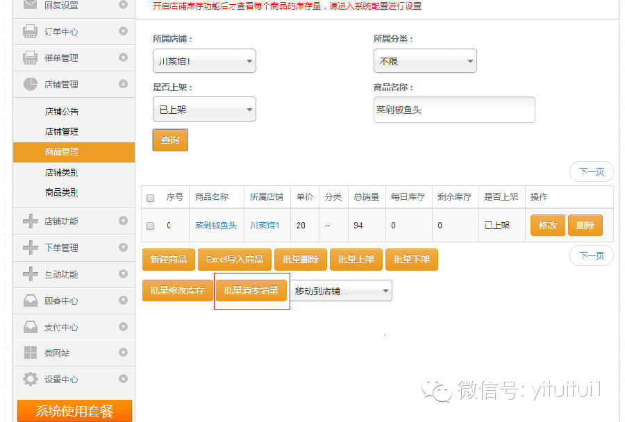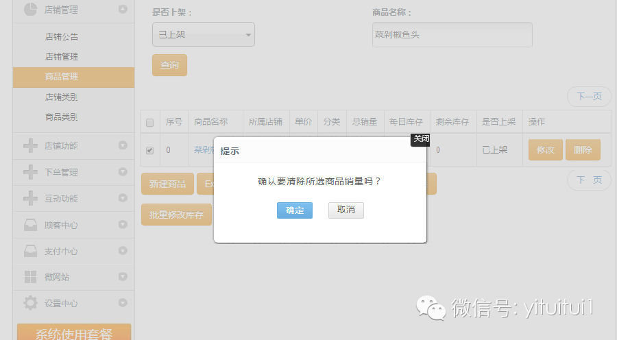 二.对于跨天营业的商家来说,拥有手动清除销量是很重要的,对此,我们新增了手动批量清除商品销量,从而恢复满库存量。操作应该是这样的:进入到商品管理,选择你要恢复库存的宝贝,然后点击批量清除销量即可手动的恢复了库存量。 商家只要简单几步,就能方便的控制好自己的一个库存量,大大的提高了商家对商品的管理,减少了不必要的麻烦,让每一位商家都能轻松经营微网店!