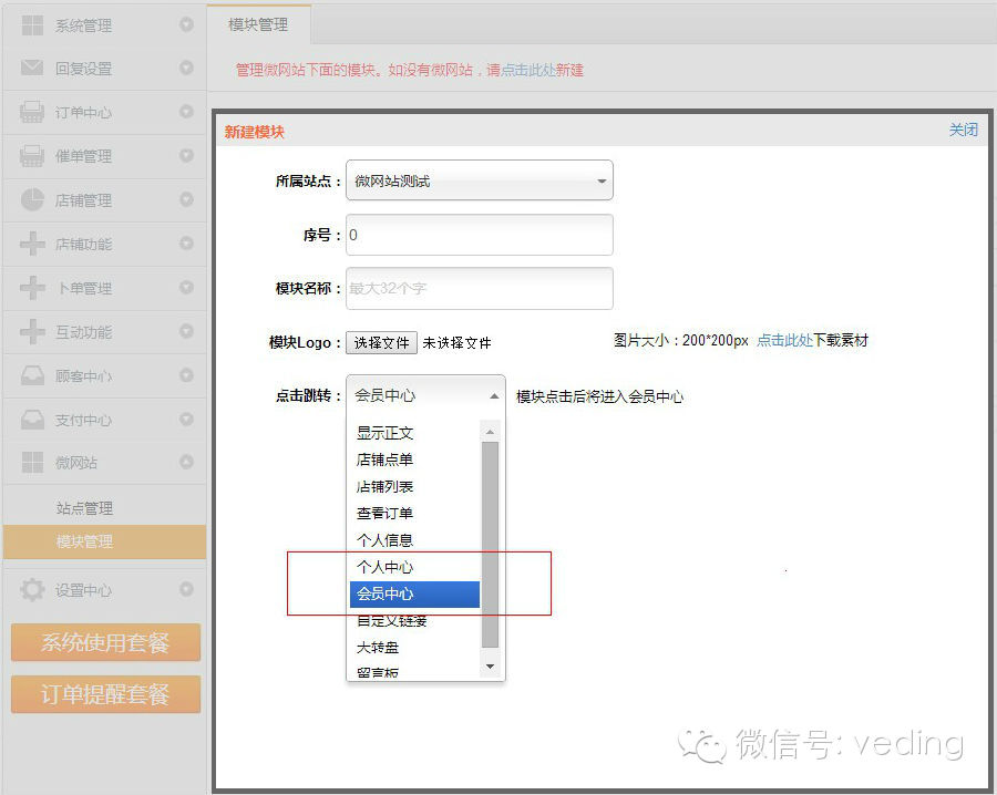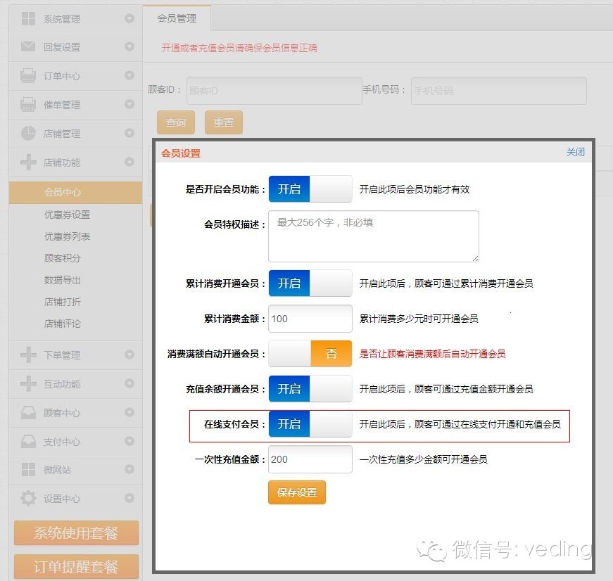 三、微订会员功能支持“在线充值会员”,“消费满额开通会员”以及“手动后台开通会员”三种方式,这次我们完善了手动后台开通会员,用户反映将在线开通会员和消费满额开通会员两种方式,同时关闭的情况下是无法进行手动开通会员的,对此,我们在会员设置中新增“在线支付会员”功能,也就说商家可以自由控制在线支付会员了,关闭后顾客将不能进行在线支付开通会员了,如果商家既不想消费满额开通会员,又不想在线支付成为会员,那么关闭“在线支付会员”和关闭“消费满额会员”是不错的选择,大伙不妨去试试哦,操作如图所示: 最后,和大家简单的说个小功能,就是会员功能已经独立开来了,图文素材,微网站模块以及自定义菜单都可以跳转到会员中心,无需跳转至个人中心再到会员板块了,省去了多个步骤,快速的引导用户进入会员中心,享受会员待遇!