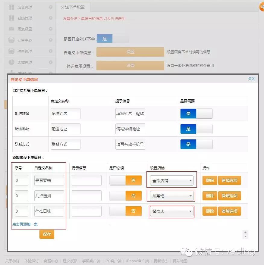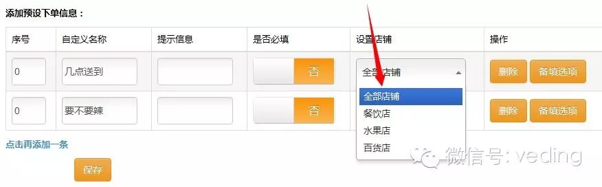此次我们主要是对预设下单进行了分店铺设置,让每一个店铺都可以拥有不同的下单预设信息: