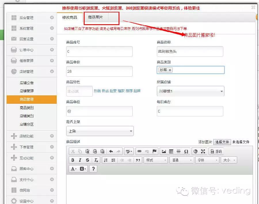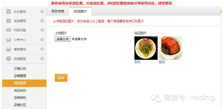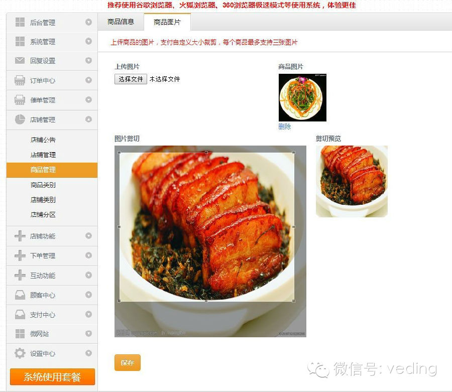 上一条:微信订餐的好处 下一条:商家为什么要用微信订餐呢? 免责声明:部分文章信息来源于网络以及网友投稿,本网站只负责对文章进行整理、排版、编辑,是出于传递更多信息之目的,并不意味着赞同其观点或证实其内容的真实性,如本站文章和转稿涉及版权等问题,请作者及时联系本站,我们会尽快处理。 责任申明:官方所有内容、图片如未经过授权,禁止任何形式的采集、镜像,否则后果自负! 标题:商品图片支持裁剪功能 地址:https://www.veding.com/static/v2/notice/146.html 相关资讯
