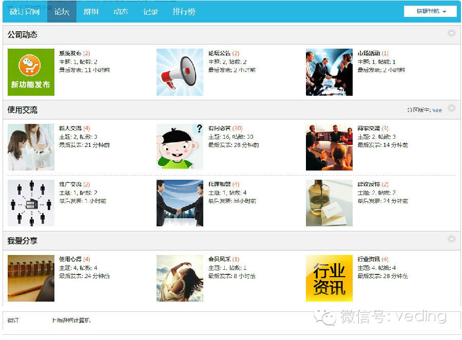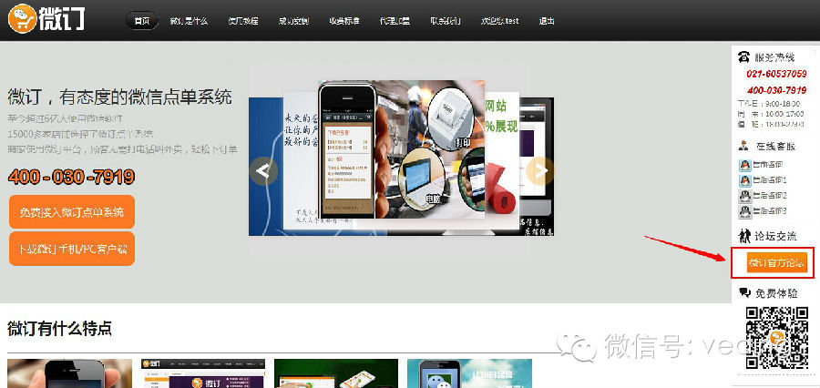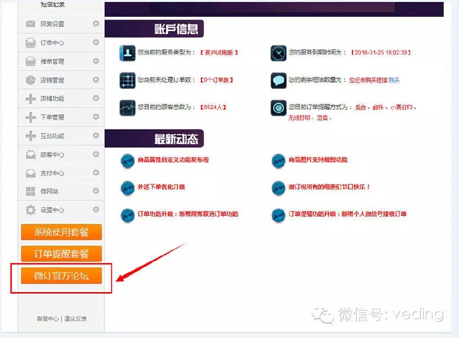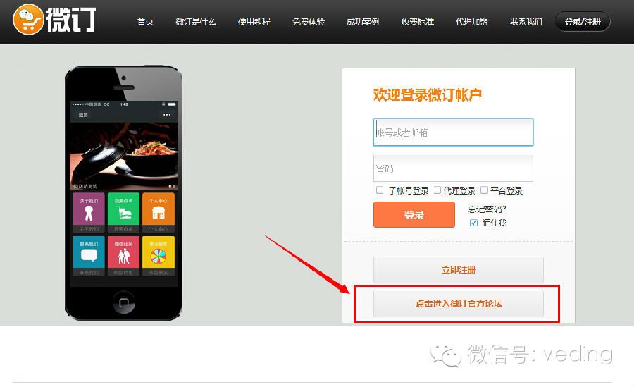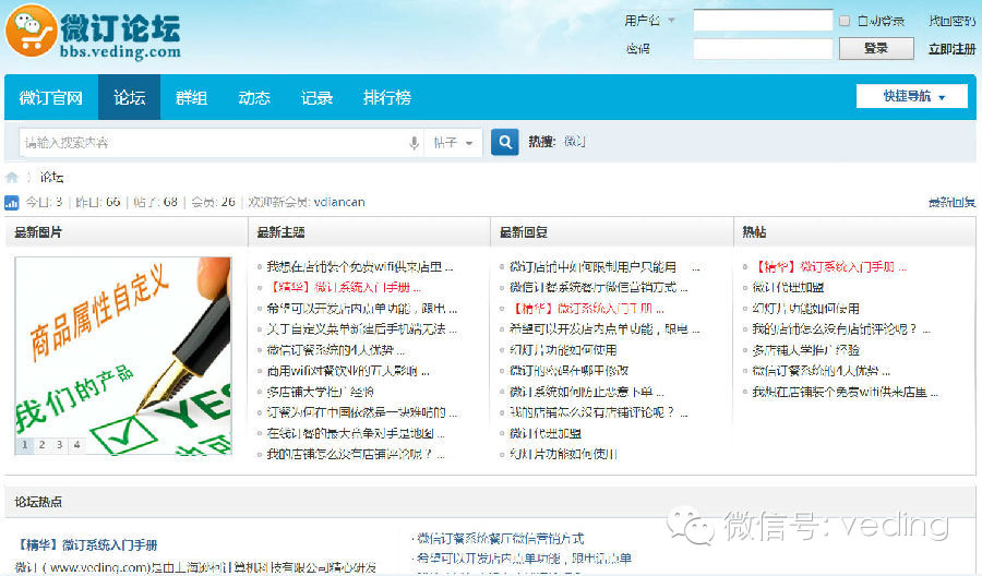 这里是商家与商家之间的交流,商家与我们的交流,商家与用户交流的一个平台,这里有我们的资深工程师为大家悉心解答,这里有我们的高级营销师给大家分享微信推广技巧,赶紧加入我们微订官方论坛吧,论坛网址请牢记:http://bbs.veding.com