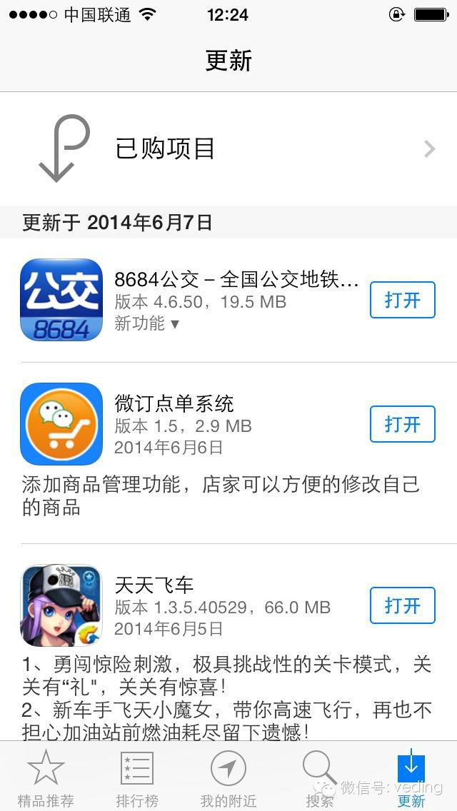 您可以进进入“更新”那个tab,会显示有“微订”的更新字样,如果是在wifi条件下,应用是会自动更新的: