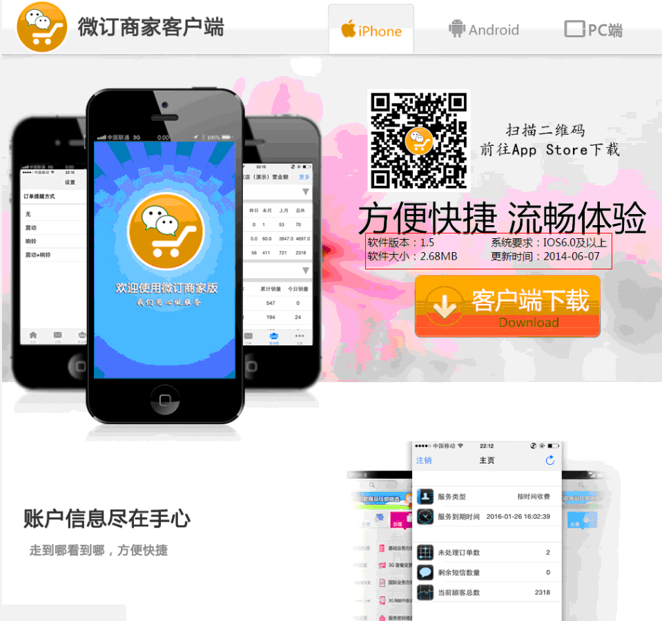 上一条:微信小店和微订有什么不同 下一条:店铺新模板谍照曝光 免责声明:部分文章信息来源于网络以及网友投稿,本网站只负责对文章进行整理、排版、编辑,是出于传递更多信息之目的,并不意味着赞同其观点或证实其内容的真实性,如本站文章和转稿涉及版权等问题,请作者及时联系本站,我们会尽快处理。 责任申明:官方所有内容、图片如未经过授权,禁止任何形式的采集、镜像,否则后果自负! 标题:微订iPhone客户端V1.5正式版发布啦 地址:https://www.veding.com/static/v2/notice/167.html 相关资讯