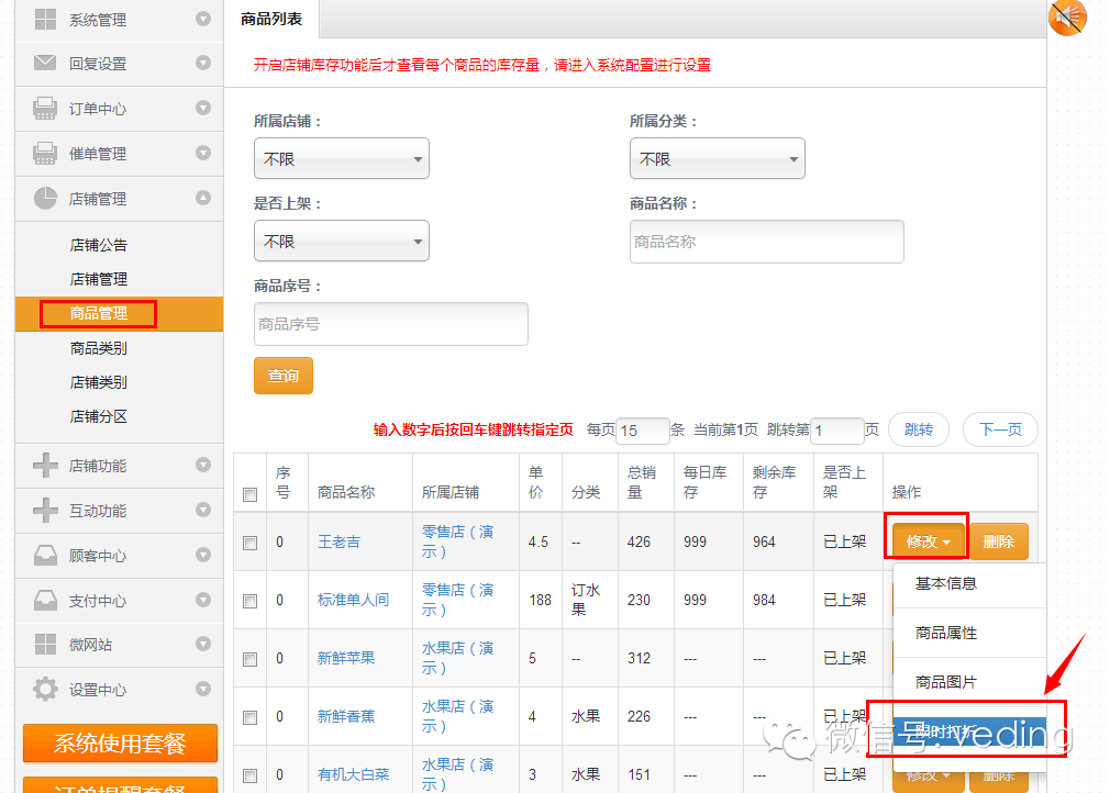 商家只需登陆微订系统后台,店铺管理中找到需要限时打折的商品,点击对应的修改即可进入设置,如下图所示: