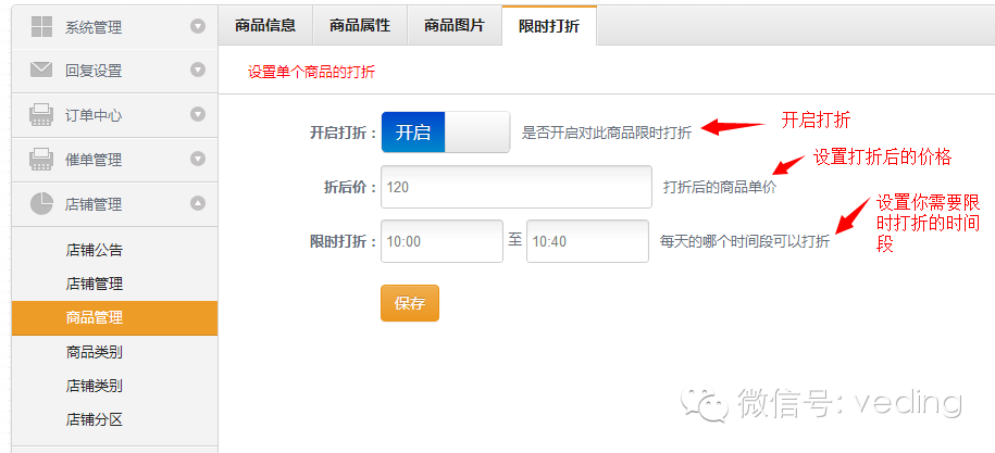首先要开启限时打折功能,然后对打折后的价格进行设置,例如你的原价是200元,打折后价格你为120元,则折扣后的价格填写120即可,然后对打折设置一个时间段就大功告成啦。如上图所示: