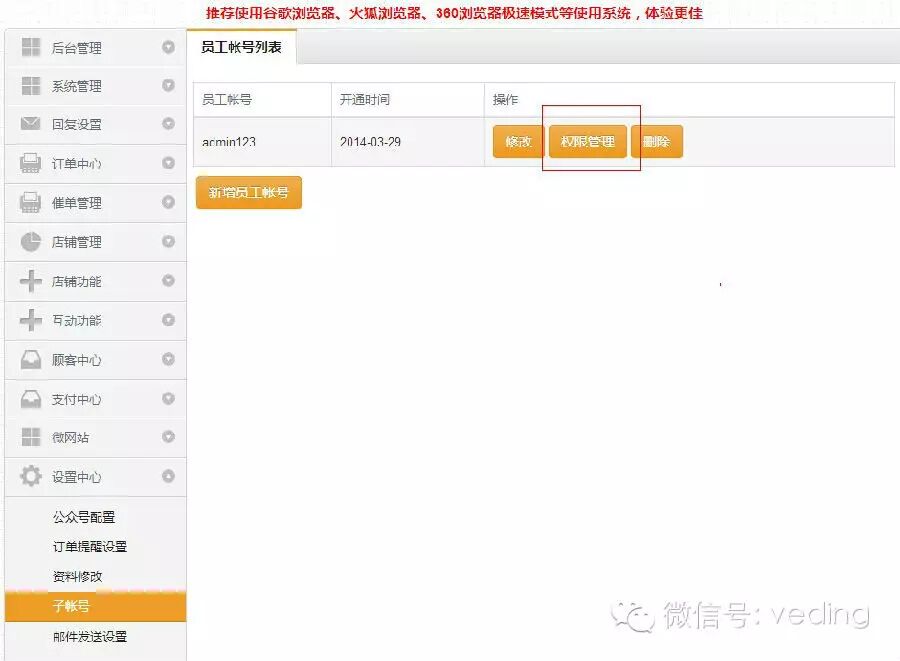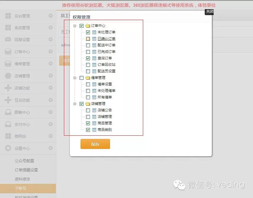 具体如何将子账号的权限进行合理分配呢?这就需要在微订的账户(即普通账号)后台设置,登陆后台进入“设置中心”,找到“子账号,点击子账号右边的“权限管理”,会弹出一个权限选项窗口,可以为该子账号设置对应的权限,操作如下图所示: