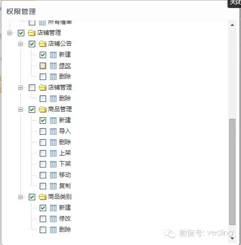 此功能的强大在于,能够非常精细的分配了每一个功能权限,这让许多“危险操作”得到了很好的控制,比如:平台商不能让商家把订单删除了,否则就赚不到营业额。那么,他就可以把删除订单的权限给禁止。 具体每个功能权限强下图所示: