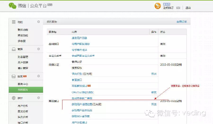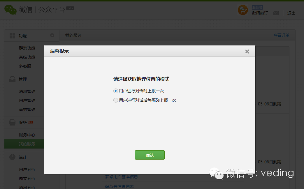 2、在微信公众平台后台开启“获取用户地理位置"服务,在服务——我的服务,操作如下图所示: 点击确认即可完成公众后台的开启。