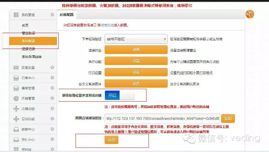 1、只要是服务号那么可以在微订系统后台开启“获取地理位置推送附近店铺” 功能,在系统管理,系统配置中选择开启即可,此功能开启前需要给你的店铺进行标记地理位置,切记!如下图所示: 开启“获取地理位置推送附近店铺”功能。