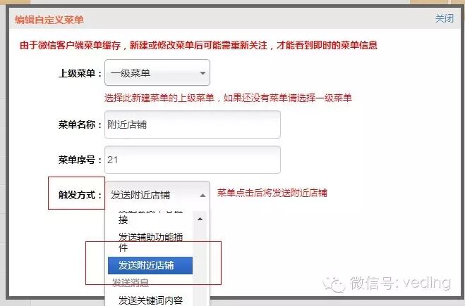 另外,服务号除了自动推送地理位置外,用户还可以通过自定义菜单手动获取附近的店铺。商家需要在微订后台自定义菜单选择触发方式为“发送附近店铺”,如下图所示。