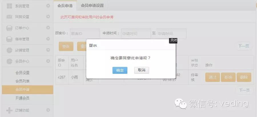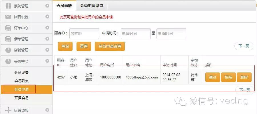 商家可以在会员中心,会员申请中查看用户提交的会员申请,如上图所示。