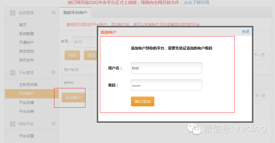 现在平台帐号支持加入其它帐号下的店铺,不局限于一个微订账号下的店铺了,只要是微订的店铺都能添加至任意一个平台上,只要商家提供微订账号和密码,就可以轻松把改微订账号下面的店铺添加进来,简单的几步操作,就能快速的搭建一个庞大的微信商圈了,具体如何添加呢?一起看看 在平台后台,平台账户中添加微订账户。