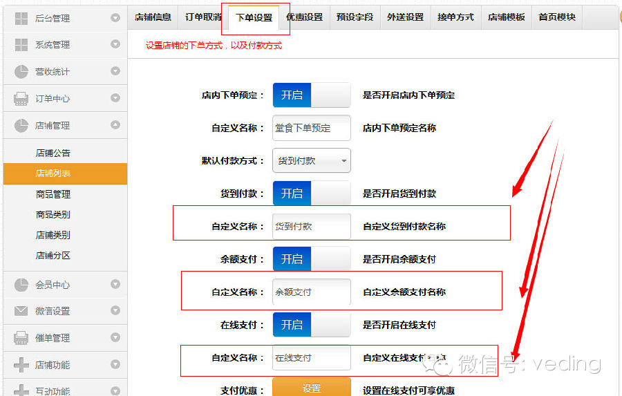 新增“付款方式自定义名称功能”,有很多商家反映能不能更改“货到付款”,“在线支付”,“余额支付”三种付款方式的名称,今天我们满足了大家的要求,付款方式的名称都可以商家自定义啦!想改就改,更改为自己喜欢的名称,比如,我们可以将“在线支付”改成“快递支付”等。操作如下图所示: 在店铺列表中自定义付款名称。