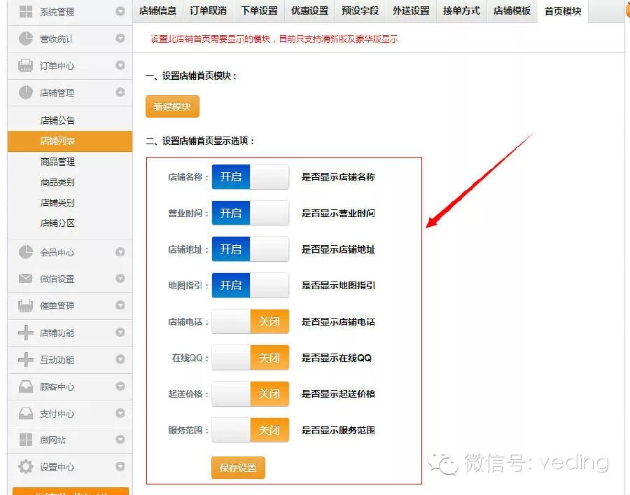 后台设置的开启几项都在微信店铺首页得到提现了: