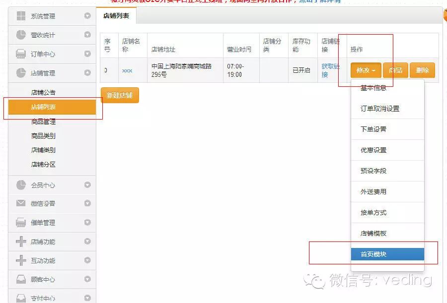 商家只需登录微订系统后台,找到对应需要设置的店铺,点击修改即可看到“首页模板”功能板块,进入“首页模板”可以设置店铺名称,营业时间,地图指引....等信息的开启和关闭,把想要展现给用户的信息开启就可以了,这样就可以很好的DIY自己的店铺首页了,是不是很方便呢?来看下图操作流程:
