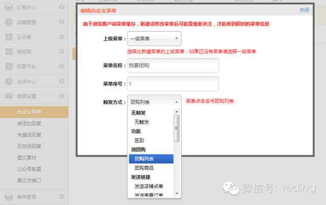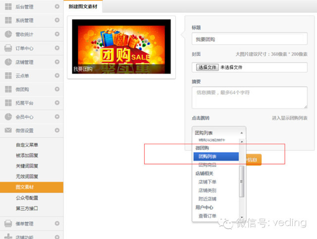 2、新建好团购店铺和团购套餐,那接下来就是如何让用户进入团购商品呢? (1)在微信设置版块里面可以设置进入团购列表和团购套餐详情,可以通过自定义菜单跳转进入,可以通过三种回复进入,需要新建图文素材通过图文素材跳转进入,如下图所示: