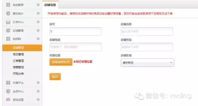 【商家操作流程】 1、商家是如何来进行团购店铺新建,团购商品的新建的呢?微团购和普通的微信下单不一样,团购不只是针对一种商品,大部分是针对多种商品套餐而制定的团购活动。商家需要在微订后台“微团购”功能板块进行团购商品的搭建,如下图所示: (1)商家需要在店铺管理 里面新建好团购店铺,图下图所示: